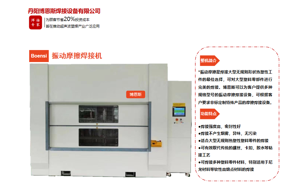 丹陽博恩斯焊接設(shè)備有限公司是塑料焊接領(lǐng)域集研發(fā)設(shè)計、生產(chǎn)制造、銷售服務(wù)為一體的企業(yè)。公司自成立以來堅持“以人為本”的理念,組織了一支強大的技術(shù)研發(fā)團隊,攜多年來積累的豐富經(jīng)驗,并結(jié)合國際先進塑料焊接技術(shù),根據(jù)市場需要,不斷開發(fā)具有核心競爭力的新產(chǎn)品。公司具有很強的非標機械研發(fā)、設(shè)計、生產(chǎn)能力,可為廣大客戶定制各類專用機械設(shè)備。公司設(shè)計生產(chǎn)的塑料焊接設(shè)備已廣泛應(yīng)用于汽車、電子、家電、醫(yī)療器械、無紡布...